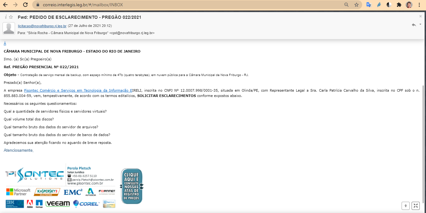 A empresa Pisontec Comércio e Serviços em Tecnologia da Informação EIRELI, inscrita no CNPJ Nº 12.0007.998/0001-35, situada em Olinda/PE, com Representante Legal a Sra. Carla Patrícia Carvalho da Silva, inscrita no CPF sob o n. 855.883.004-59, vem, tempestivamente, de acordo com os termos editalícios, SOLICITAR ESCLARECIMENTOS.